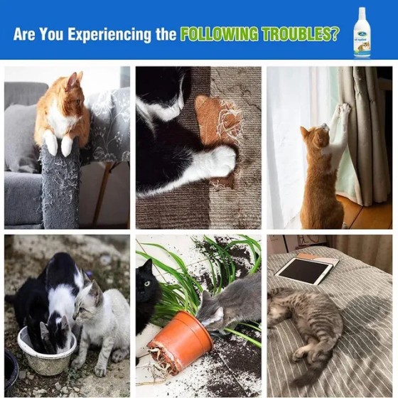 Transform your feline's habits with Cat Deterrent Spray for Training, Natural Plant-Based Indoor & Outdoor Repellent for Cats, Safe Scratch Deterrent, Long-Lasting Effect Pet Training Aid. Featuring kitten mewing and anthropomorphic cat to support effective cat behavior training.