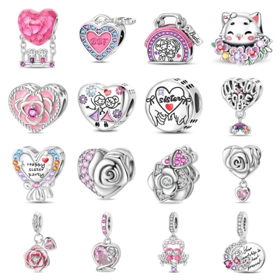 S925 Silver Family Style Sister Love Pink Rose Charm Beads DIY Jewelry Accessories Bracelet Cross-border New