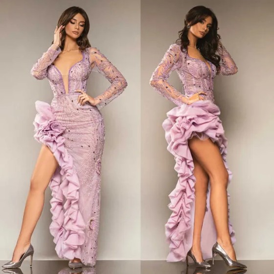 Shiny Ruffles Evening Dress Long Sleeves Beads Rhinestone Irregular Prom Gown High Slit Cocktail Dresses Customized