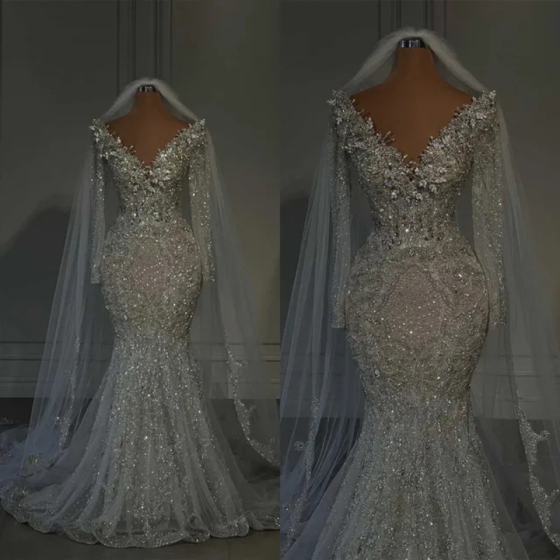 Buyers' PicksGlitter V Neck Wedding Dresses Crystal Mermaid Bridal Gowns Sequins Beading Sweep Train Long Sleeve Custom Made Bride Dress Plus Size (Size Size Guide)