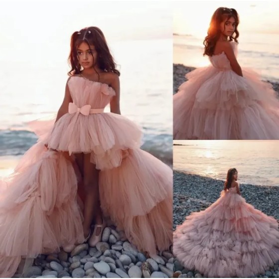 Blush Pink High Low wer Girl For Beach Wedding Kids Strapless Party Girls Pageant Dresses Princess Birthday Photoshoot