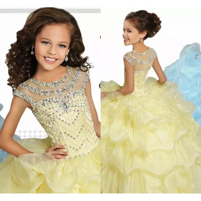 Light Yellow Princess Ball Gown Girls Pageant Gowns Cap Sleeves Crystals Beaded Ruffles Performance Dresses Kids Formal Party Gowns