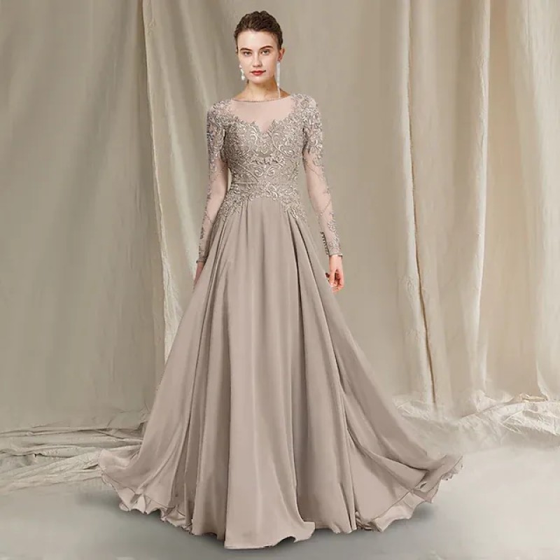 Buyers' PicksVintage A-Line Mother of the Bride Dress 2025 Elegant Jewel Floor Length Chiffon Lace Groom Party Gowns Long Sleeve Pleats Appliques Champagne Robe De Soiree