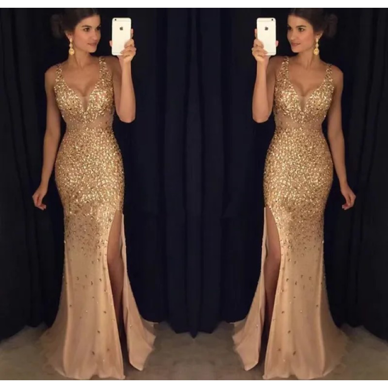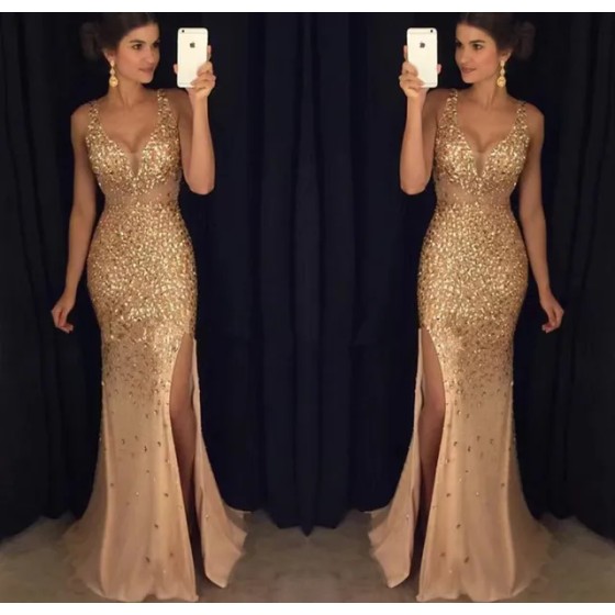Prepare the mint green prom gown for the upcoming prom? Then you need to see Black & Gold Evening Dress - Elegant Side Split A-Line Sleeveless Prom Gown | Crystals & Sequins Party Vestidos in sandrose and other marina black nude and pink feathered robe on DHgate.com.
