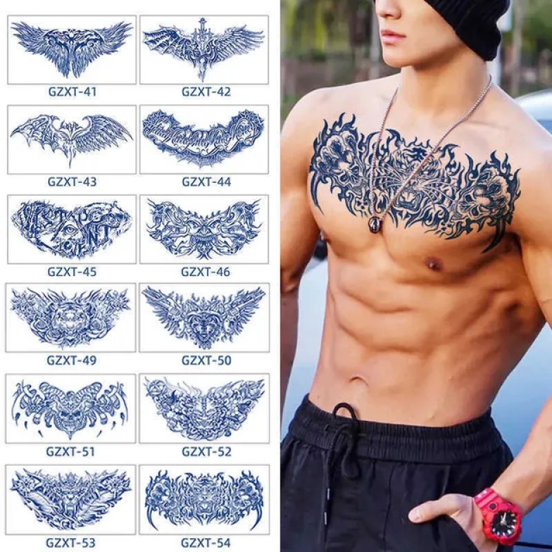 Temporary Tattoos Juice Tatoo Sexy Waterproof Temporary Tattoo Wing Totem on Chest Sternum Blue Tattoo Sticker Fake Tattoos for Men Women Z0403