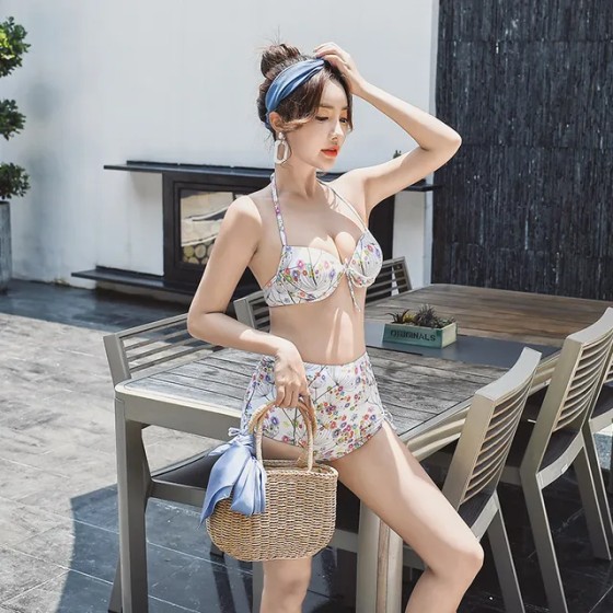 Tankinis Push Up Vintage Sweet 3 Pieces Set Covered Belly Show Thin Hot Spring Sexy Women Small Bust Swimsuit