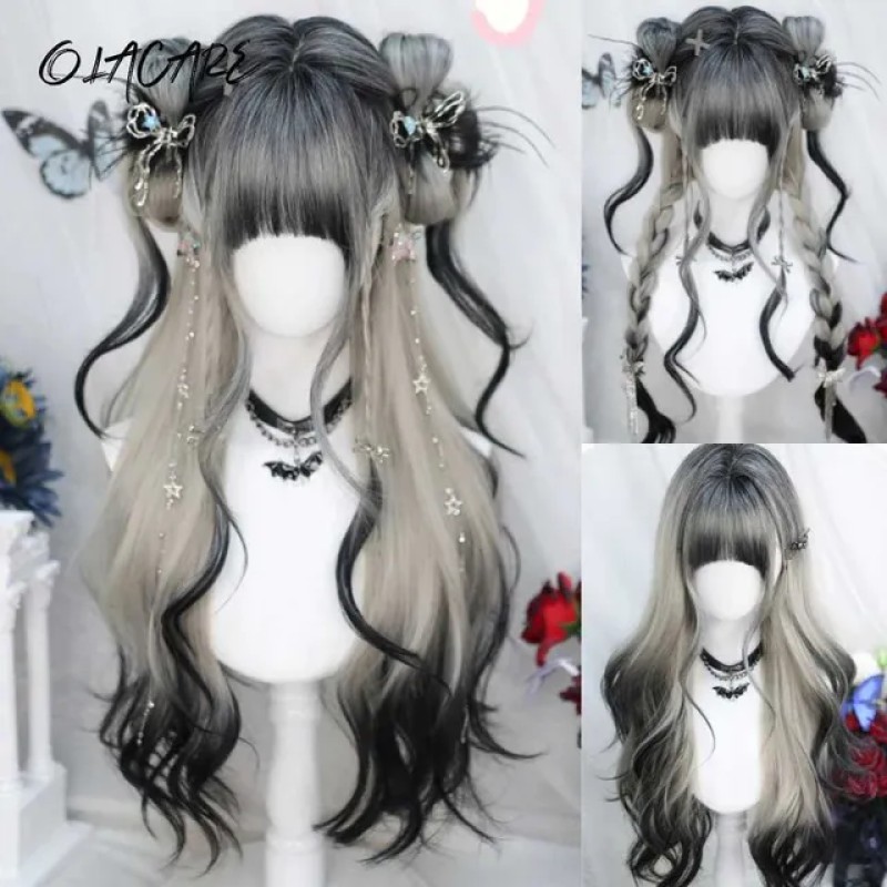 OLA Long Body Wave Black And Gray Ombre Cosplay Wigs Heat Resistant Synthetic Wigs Bangs Natural Lolita Wigs For Women Halloween S251016