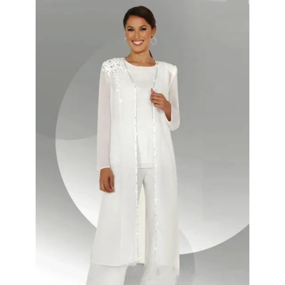 White Chiffon Long Sleeves Mother of the Bride Pant Suits With Long Blouse Sequins Beaded Three Pieces Mother of Groom Pant Suit BA3961
