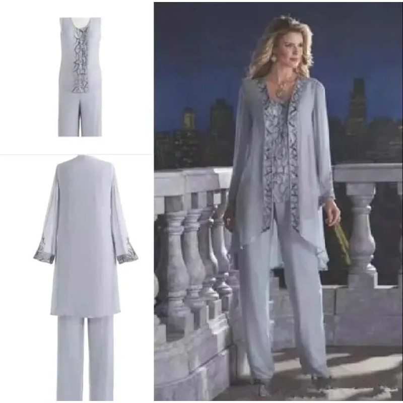 Silver Mother Of The Bride Three-Piece Pant Suit Lace Chiffon Beach Wedding Mother's Groom Dress Long Sleeve Wedding Guest Dresses BA6571