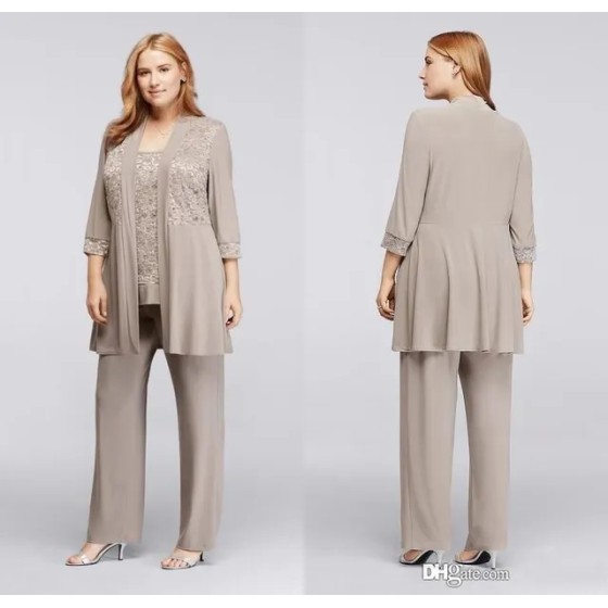 2018 Grey Chiffon Mother Of The Bride Suits Pants Jacket Long Sleeves Three Pieces Plus Size Lace Appliques Ankle-Length Mothers Suits